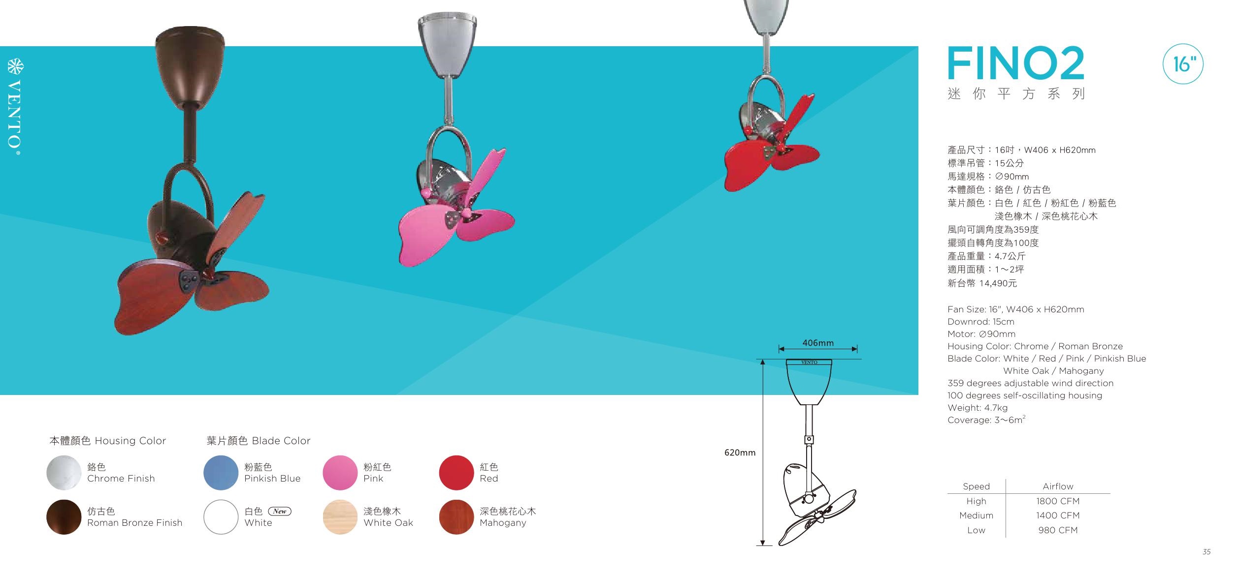 FINO 16" 本體 / 葉片顏色 鉻色、仿古色 / 粉藍色、紅色、粉紅色、淺色橡木、深色桃花心木 標準吊管 15 cm 馬達規格 Ø 90 燈具配置 此款無燈具 電壓 110V ( 220V 需要備註 訂購前請確認電壓 ) 重量 4.7 Kg 適用面積 1~2 坪 *附遙控器 (風向可調角度為359度 擺頭自轉角度為100度 )