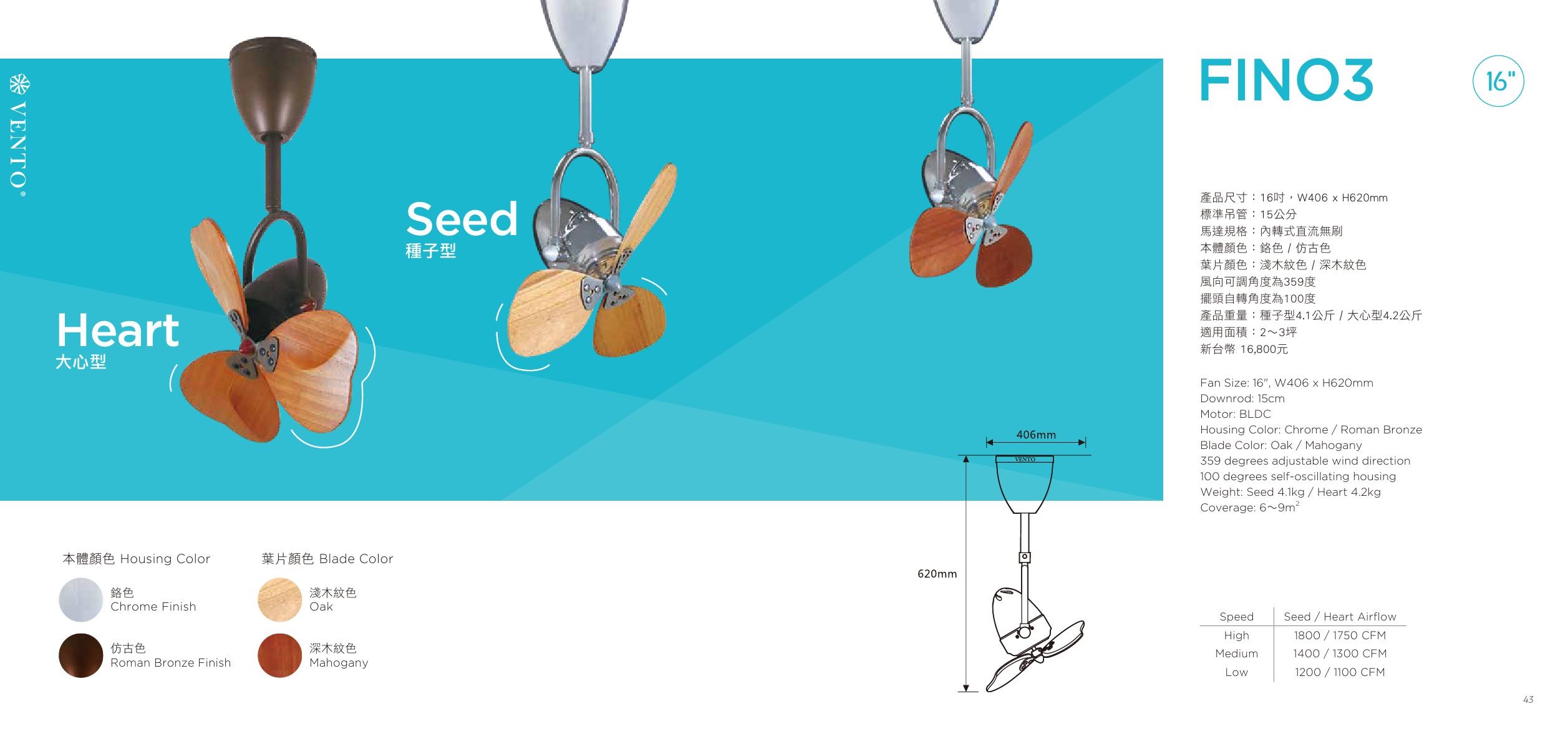FINO3 16" 本體 / 葉片顏色 鉻色、仿古色 / 淺木紋色、深木紋色 標準吊管 15 cm 馬達規格 內轉式直流無刷 (BLDC) 燈具配置 此款無燈具 電壓 110V ( 220V 需要備註 訂購前請確認電壓 ) 重量 4.2 Kg 適用面積 2~3 坪 *附遙控器 (風向可調角度為359度 擺頭自轉角度為100度 )