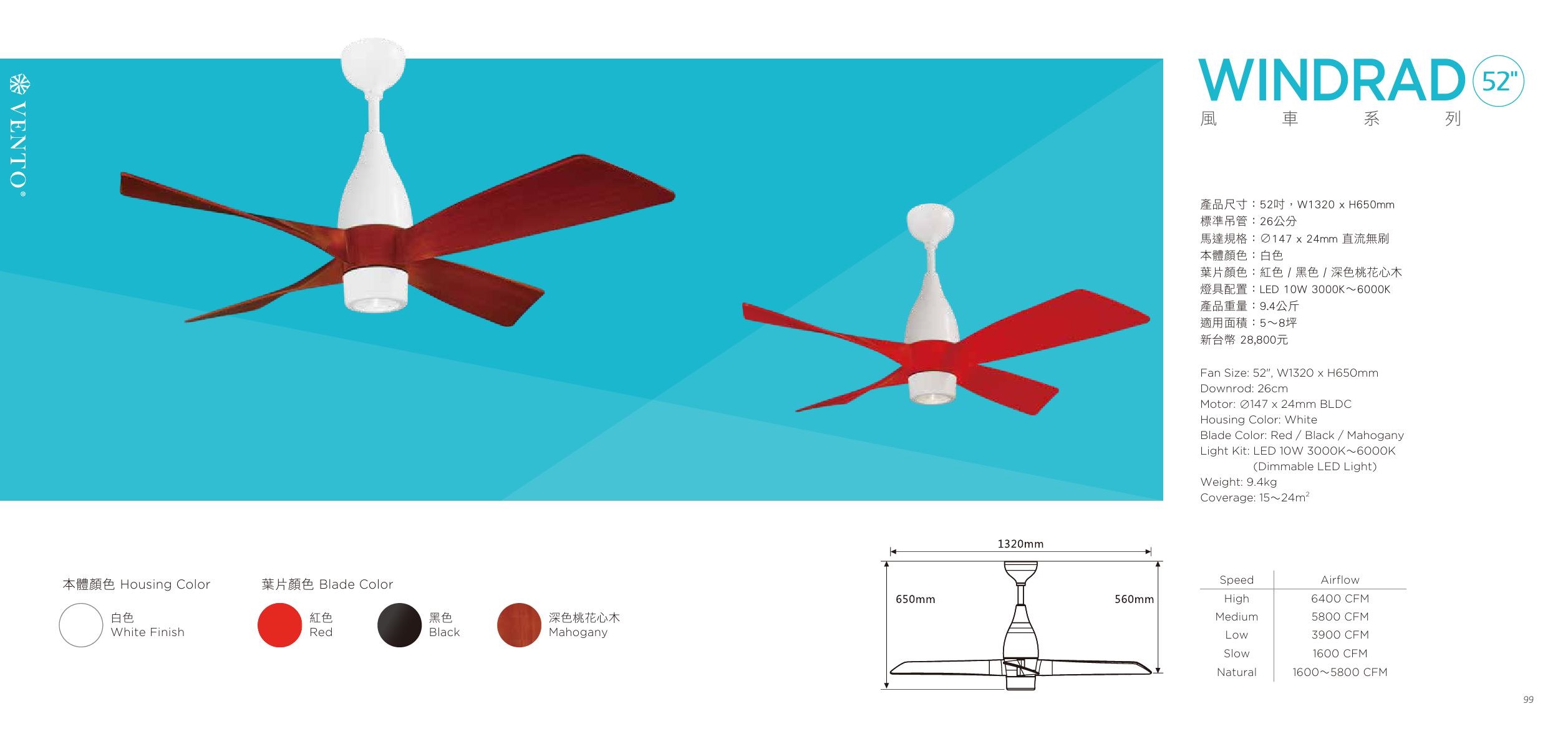 WINDRAD 52" 本體顏色 /葉片顏色 白色 /紅色、黑色、深色桃花心木 標準鋼索 26 cm 馬達規格 Ø 147 x 24mm 直流無刷 ( BLDC ) 燈具配置 LED 10W 3000K~6000K 電壓 110V ( 220V 需要備註 訂購前請確認電壓 ) 重量 9.4 Kg 適用面積 5~8 坪 *附遙控器