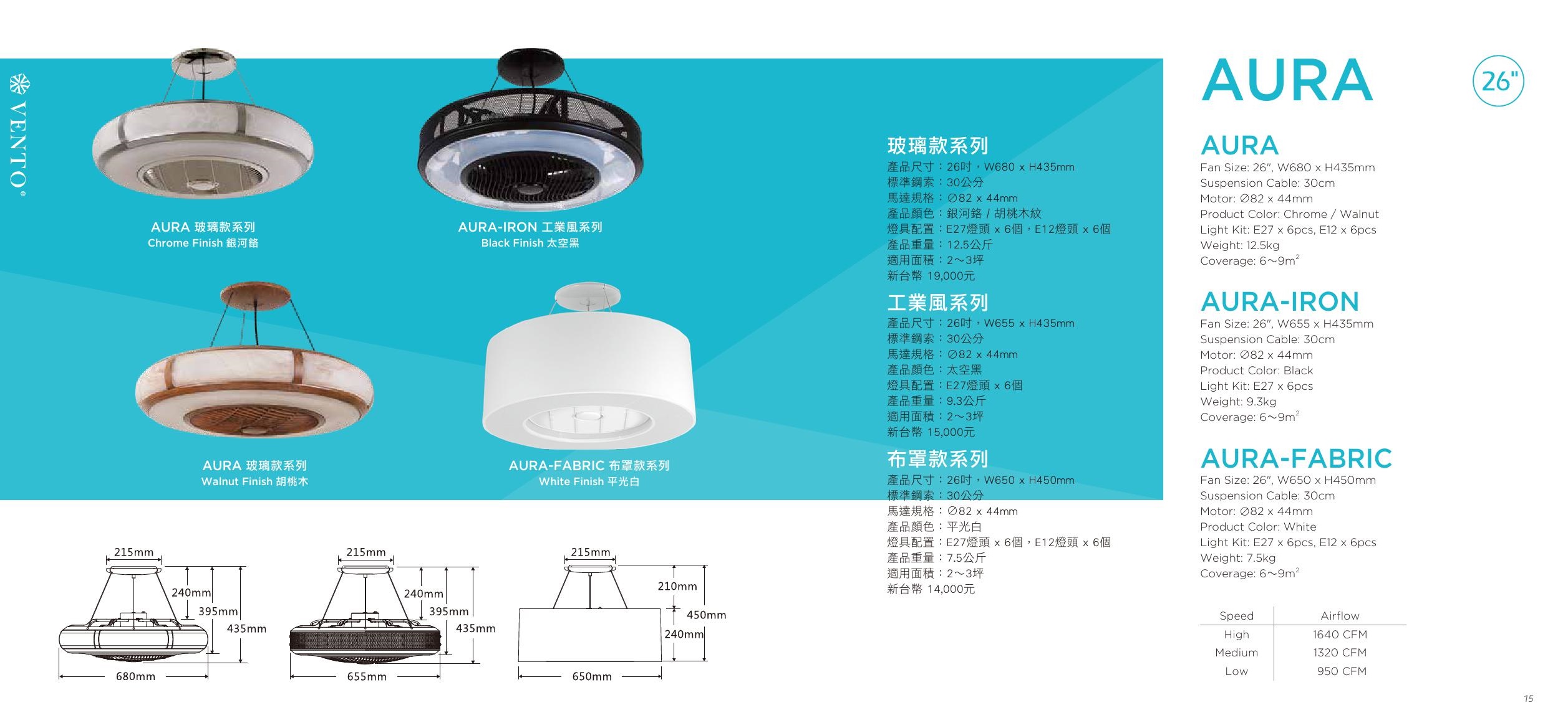 AURA 26" 系列 玻璃款/工業風/布罩款 標準鋼索 30 cm 馬達規格 Ø 82 x 44mm 燈具配置 E27 x 6 電壓 110V ( 220V 需要備註 訂購前請確認電壓 ) 重量 9.3 Kg 適用面積 2~3 坪 *附遙控器