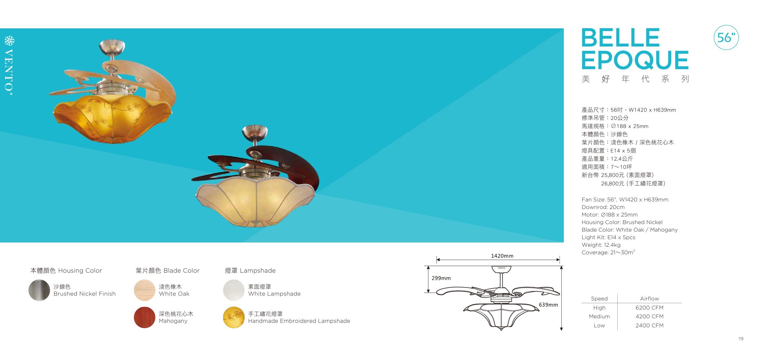 BELLE EPOQUE 56" 本體 / 葉片顏色 沙鎳色 / 淺色橡木、深色桃花心木 標準鋼索 20 cm 馬達規格 Ø 188 x 25mm 燈具配置 E14 x 5 電壓 110V ( 220V 需要備註 訂購前請確認電壓 ) 重量 12.4 Kg 適用面積 7~10 坪 *附遙控器