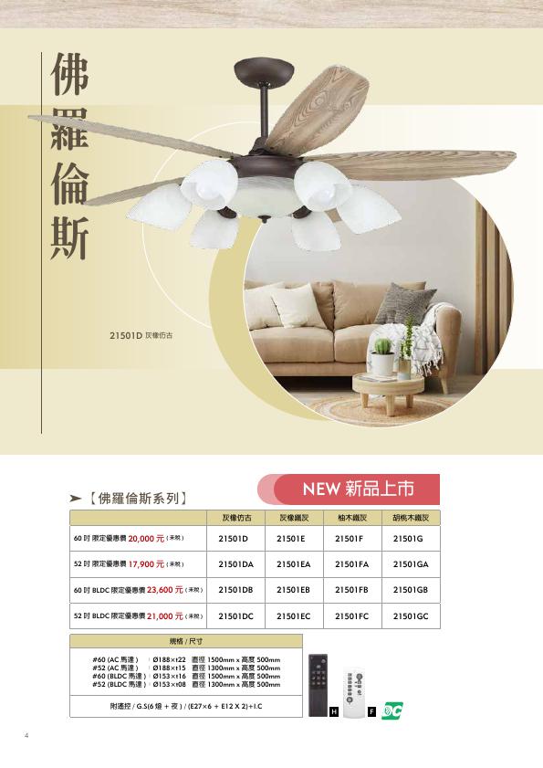 佛羅倫斯 52" 60" 顏色 灰橡仿古、灰橡鐵灰、柚木鐵灰、胡桃木鐵灰 馬達規格 AC馬達/ BLDC直流無刷 燈具配置 E27*6 +E12*2 +IC 附遙控 電壓 110V ( 220V 需要備註 訂購前請確認電壓 ) 適用面積 52" 3~4坪 60" 6~8坪 *附遙控器