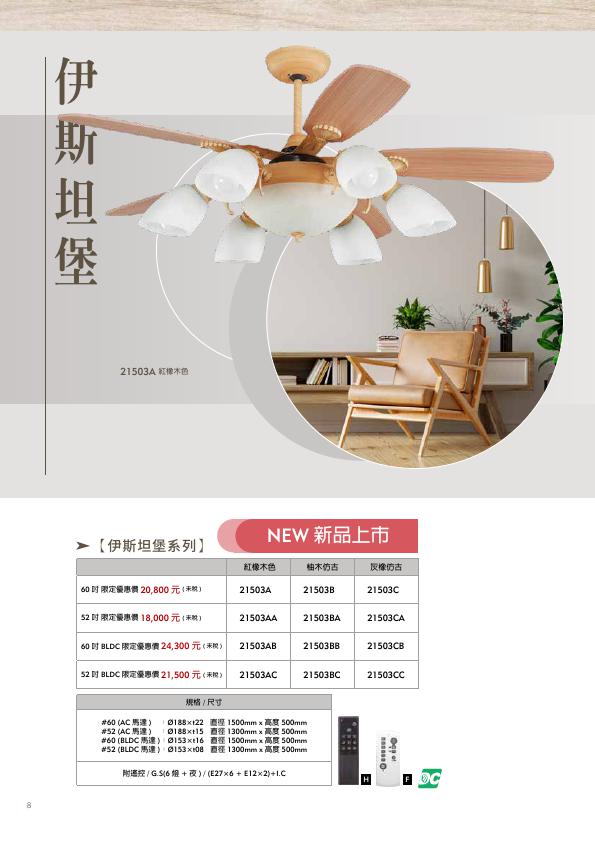伊斯坦堡 52" 60" 顏色 紅橡木色、柚木仿古、灰橡仿古 馬達規格 AC馬達/ BLDC直流無刷 燈具配置 E27*6 +E12*2 +IC 附遙控 電壓 110V ( 220V 需要備註 訂購前請確認電壓 ) 適用面積 52" 3~4坪 60" 6~8坪 *附遙控器
