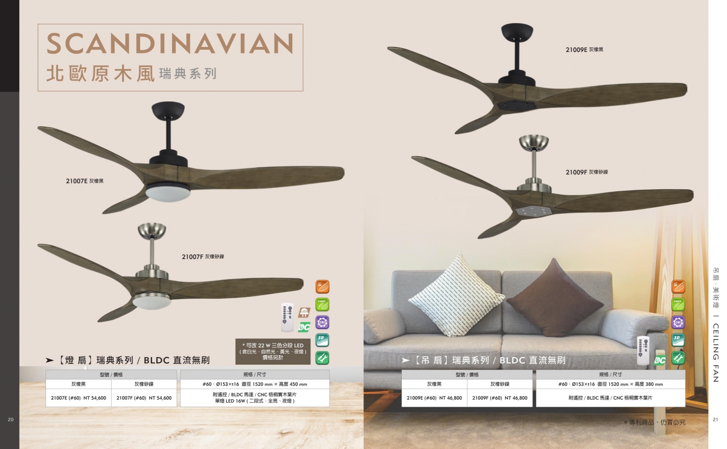 瑞典系列/ BLDC 直流無刷 #60 顏色 灰橡黑、灰橡沙鎳 馬達規格 BLDC 燈具配置 單燈 LED 16W/ 無燈款 電壓 110V ( 220V 需要備註 訂購前請確認電壓 ) 適用面積 #60" 6坪 *附遙控器