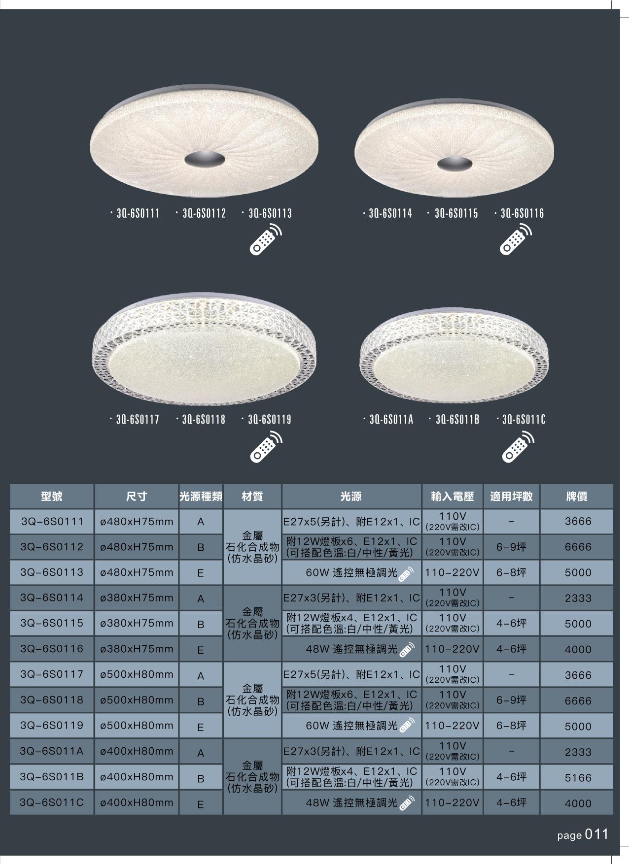 3Q-6S0111/3Q-6S0112/3Q-6S0113/3Q-6S0114 3Q-6S0115/3Q-6S0116/3Q-6S0117/3Q-6S0118 3Q-6S0119/3Q-6S011A/3Q-6S011B/3Q-6S011C 客廳 餐廳 臥室 壓克力 LED模組 E27 吸頂燈 無極遙控調光
